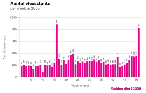 Al jaren piekt het aantal vleesaanbiedingen rondom kerst, terwijl vegetarische aanbiedingen achterblijven. Die nemen zelfs voor het derde jaar op rij af. In 2023 was in de aanloop naar kerst nog één op de zeven aanbiedingen vegetarisch; inmiddels is dat één op de elf. Hilhorst: “Een zorgelijke trend. Blijkbaar gooien supermarkten met de feestdagen hun principes steeds vaker overboord.”